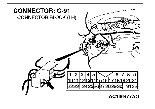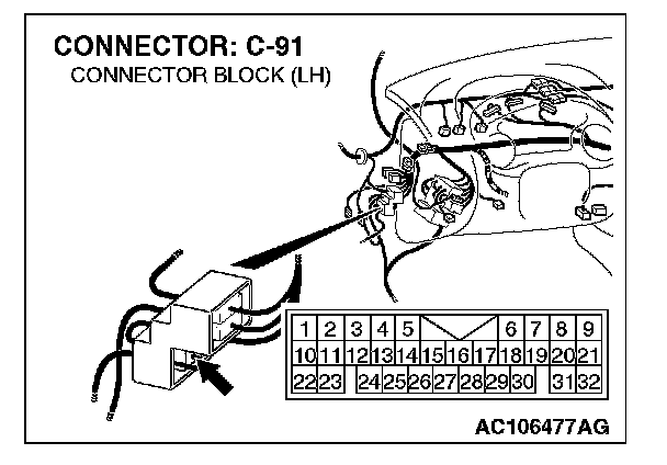 NOTE: Also check intermediate connector C-91 for loose, corroded, or damaged terminals, or terminals pushed back in the connector. If intermediate connector C-91 is damaged, repair or replace the damaged component(s) as described in Harness Connector Inspection.