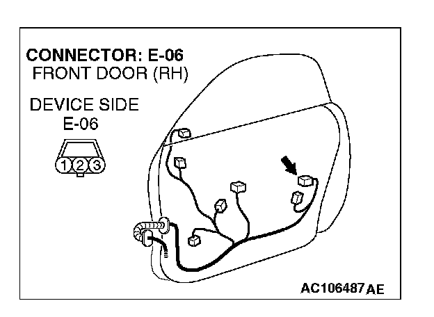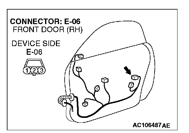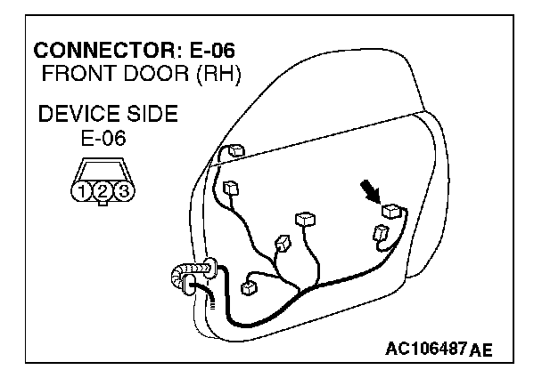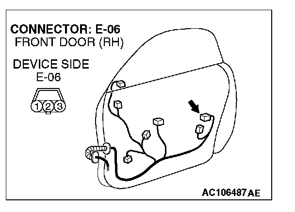 1. Disconnect passenger's door lock key cylinder switch connector E-06 and measure the resistance available at the wiring harness side of the connector.