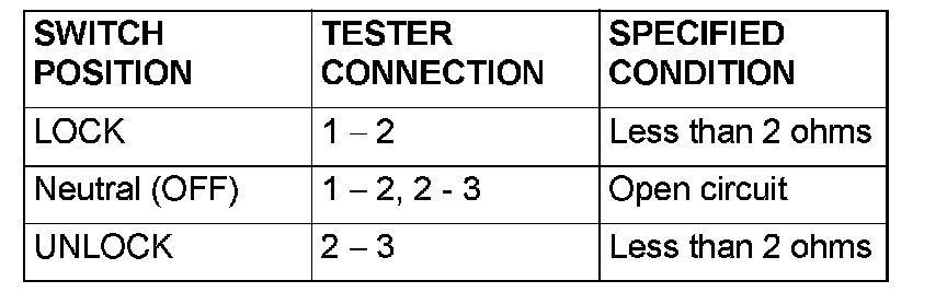 Disconnect driver's door lock key cylinder switch connector E-14.Then check continuity between the switch terminals.
