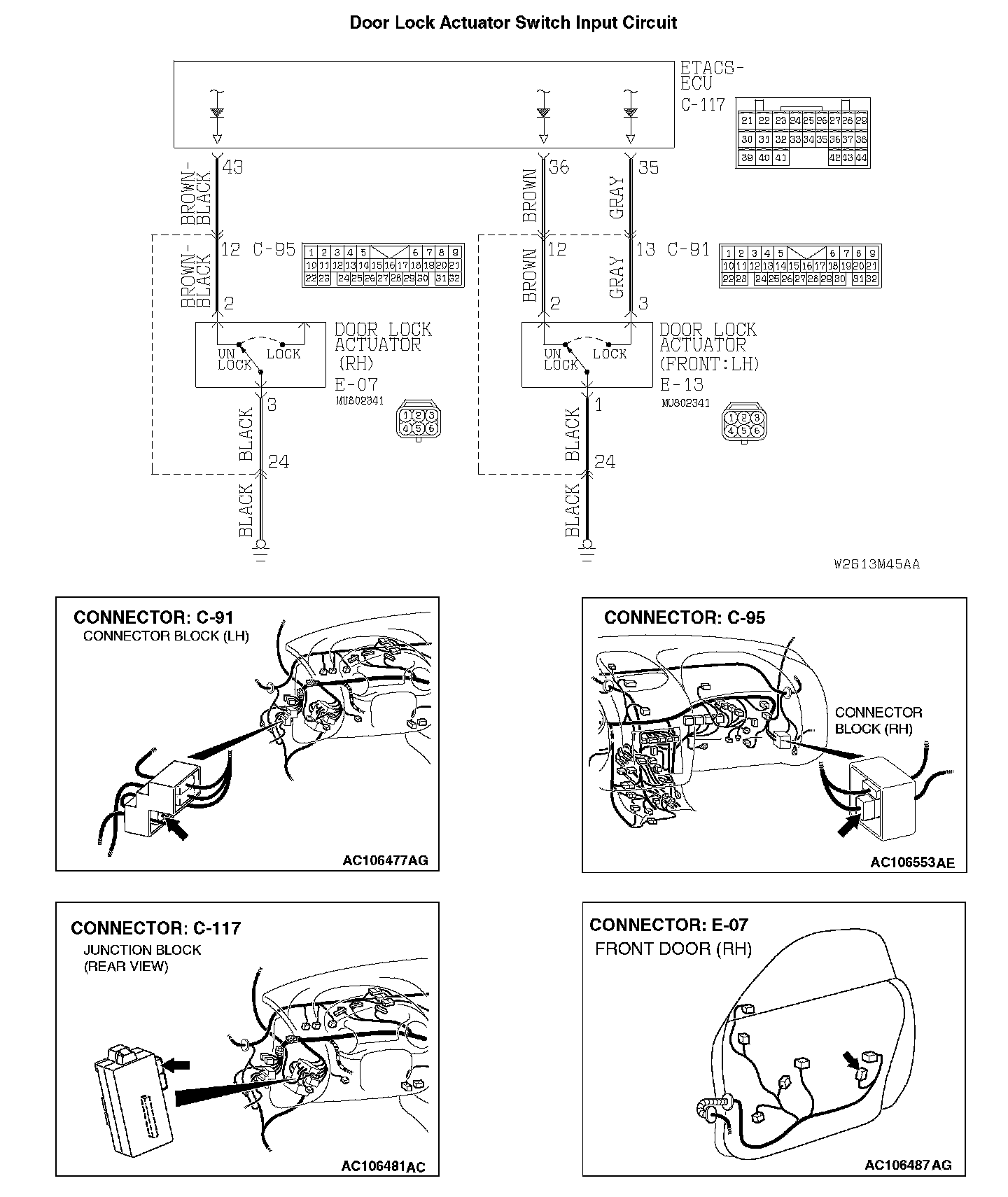 STEP 7. Check the wiring harness between driver's door lock actuator switch connector E-13 (terminals 2 and 3) and ETACS-ECU connector C-117 (terminals 36 and 35).