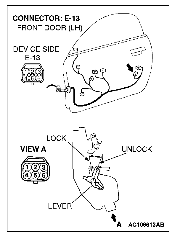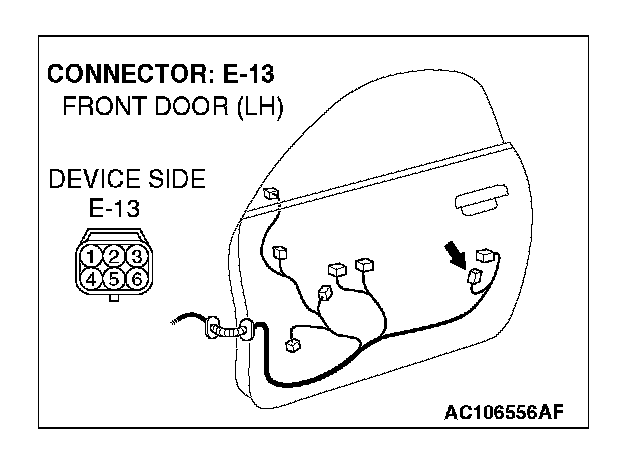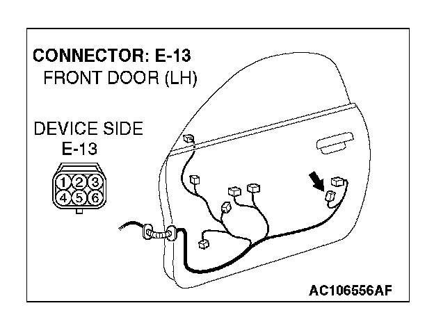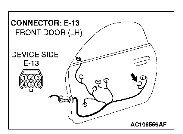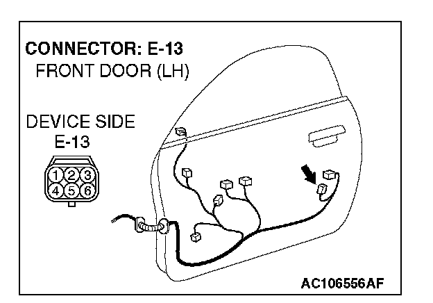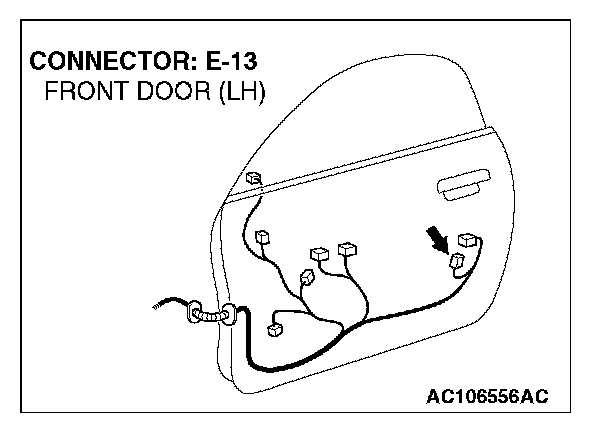 1. Disconnect driver's door lock actuator switch connector E-13 and measure the resistance available at the wiring harness side of the connector.