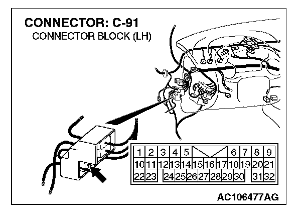 NOTE: Also check intermediate connector C-91 for loose, corroded, or damaged terminals, or terminals pushed back in the connector. If intermediate connector C-91 is damaged, repair or replace the damaged component(s) as described in Harness Connector Inspection.