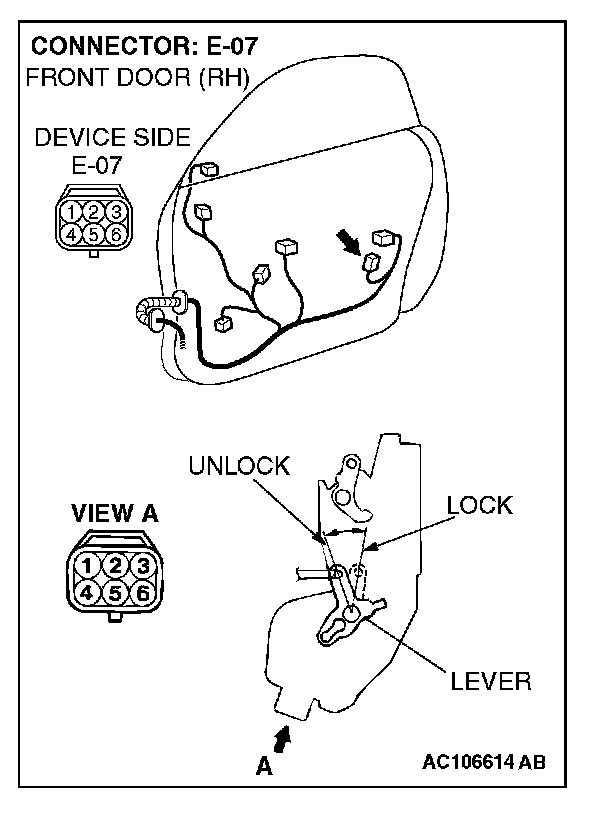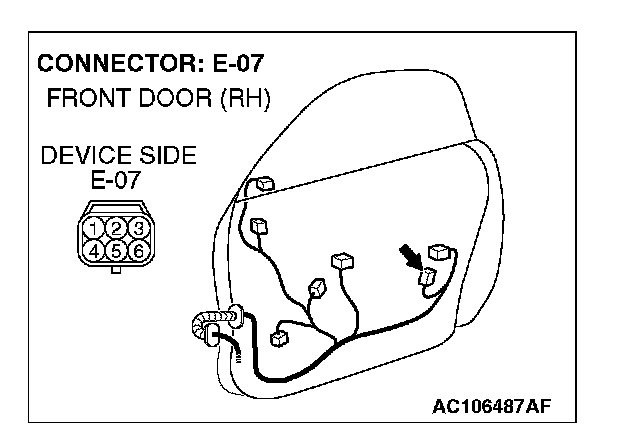 1. Disconnect passenger's door lock actuator switch connector E-07 and measure the resistance available at the wiring harness side of the connector.