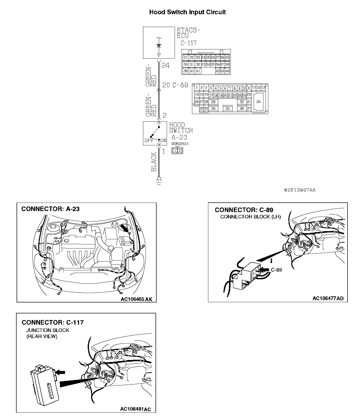 STEP 6. Check the wiring harness between hood switch connector A-23 (terminal 2) and ETACS-ECU connector C-117 (terminal 24).