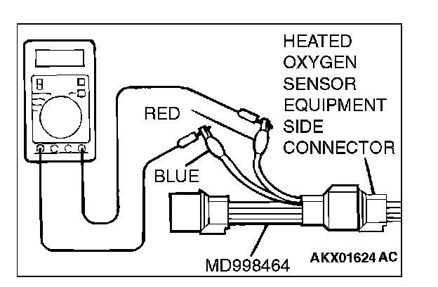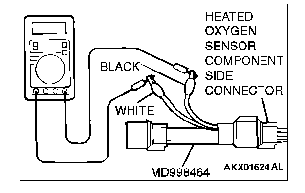 1. Disconnect the heated oxygen sensor connector and connect special tool MD998464 to the connector on the heated oxygen sensor side.