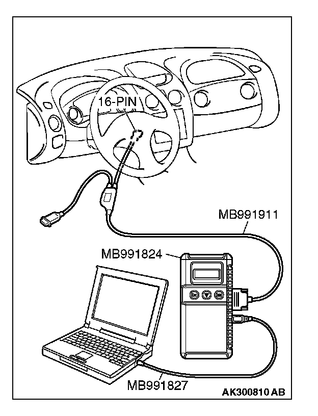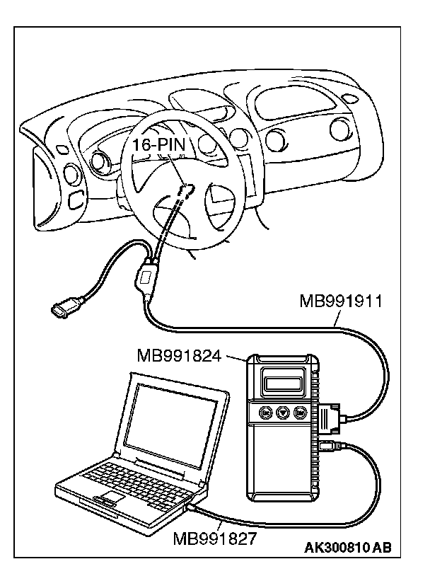 CAUTION: To prevent damage to scan tool MB991958, always turn the ignition switch to the "LOCK" (OFF) position before connecting or disconnecting scan tool MB991958.