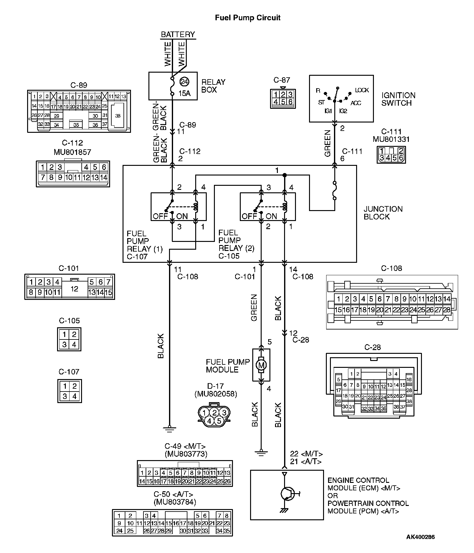 STEP 2. Check connector C-107 at fuel pump relay 1 and connector C-105 at fuel pump relay 2 for damage.