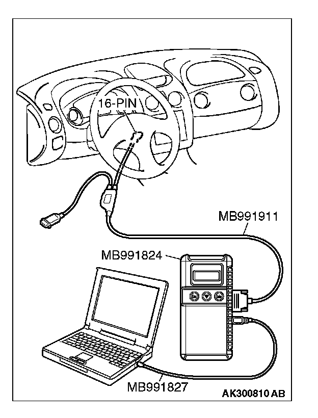 CAUTION: To prevent damage to scan tool MB991958, always turn the ignition switch to the "LOCK" (OFF) position before connecting or disconnecting scan tool MB991958.