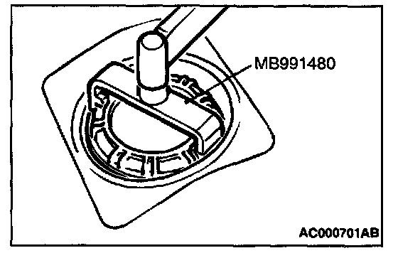 7. Use special tool MB991480 to align the mating marks on the fuel tank and fuel pump module and tighten the cap.