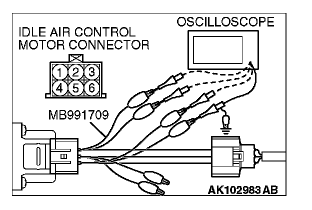 2. Connect the oscilloscope probe to the idle air control motor connector terminal No. 1, terminal No. 3, terminal No. 4 and terminal No. 6, respectively.