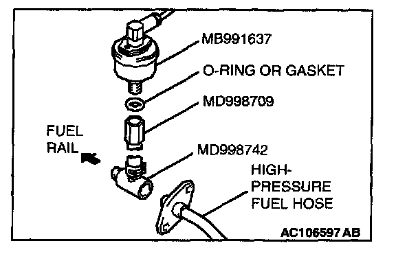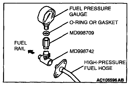b. Place a suitable O-ring or gasket on assembled special tools MD998709 and MD998742 and install the fuel pressure gauge.
