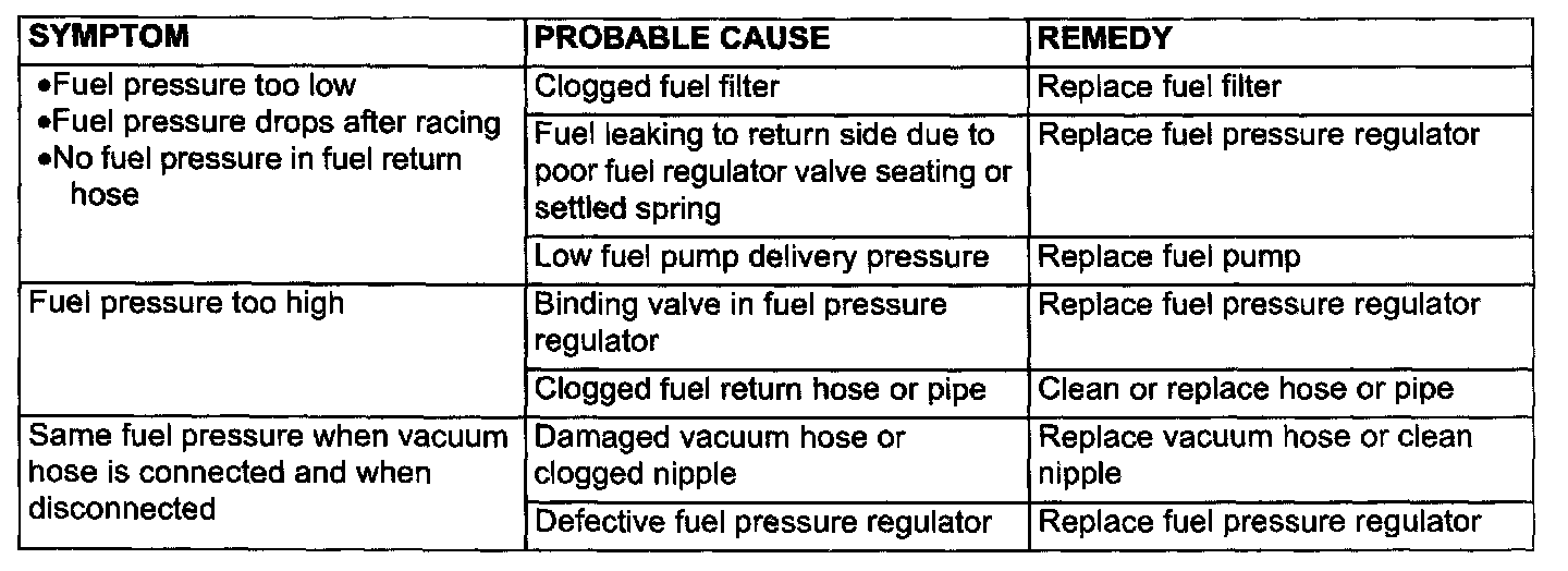 12. IF any of fuel pressure measured in steps 8 to 11 is out of specification, troubleshoot and repair according to the table.