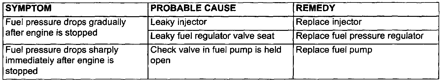 13. Stop the engine and observe fuel pressure gauge reading. It is normal if the reading does not drop within two minutes. If it does, observe the rate of drop and troubleshoot and repair according to the table. Start, then stop the engine.