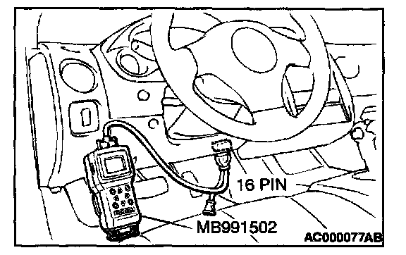 CAUTION: To prevent damage to scan tool MB991502, always turn the ignition switch to the "LOCK" (OFF) position before connecting or disconnecting scan tool MB991502.