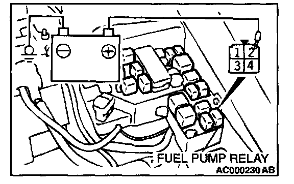 b. Remove the fuel pump relay and apply battery voltage to harness-side connector terminal number 2. Check that an operating sound can be heard from the fuel pump.