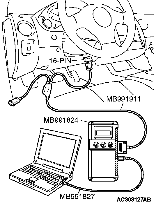 CAUTION: To prevent damage to scan tool MB991958, always turn the ignition switch to the "LOCK" (OFF) position before connecting or disconnecting scan tool MB991958.