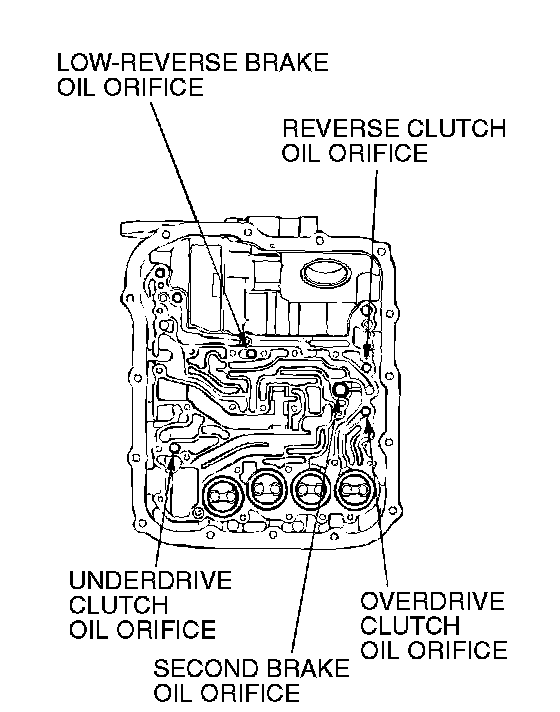 2. Blow 108 kPa (15 psi) compressed air into the each brake oil orifice and clutch oil orifice of the transaxle case, and check if each brake and each clutch piston move and air pressure is maintained.