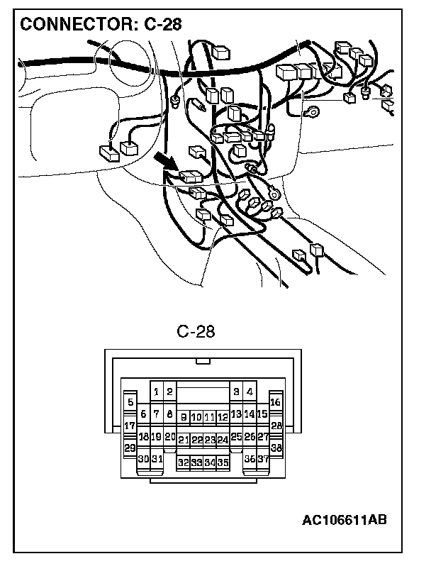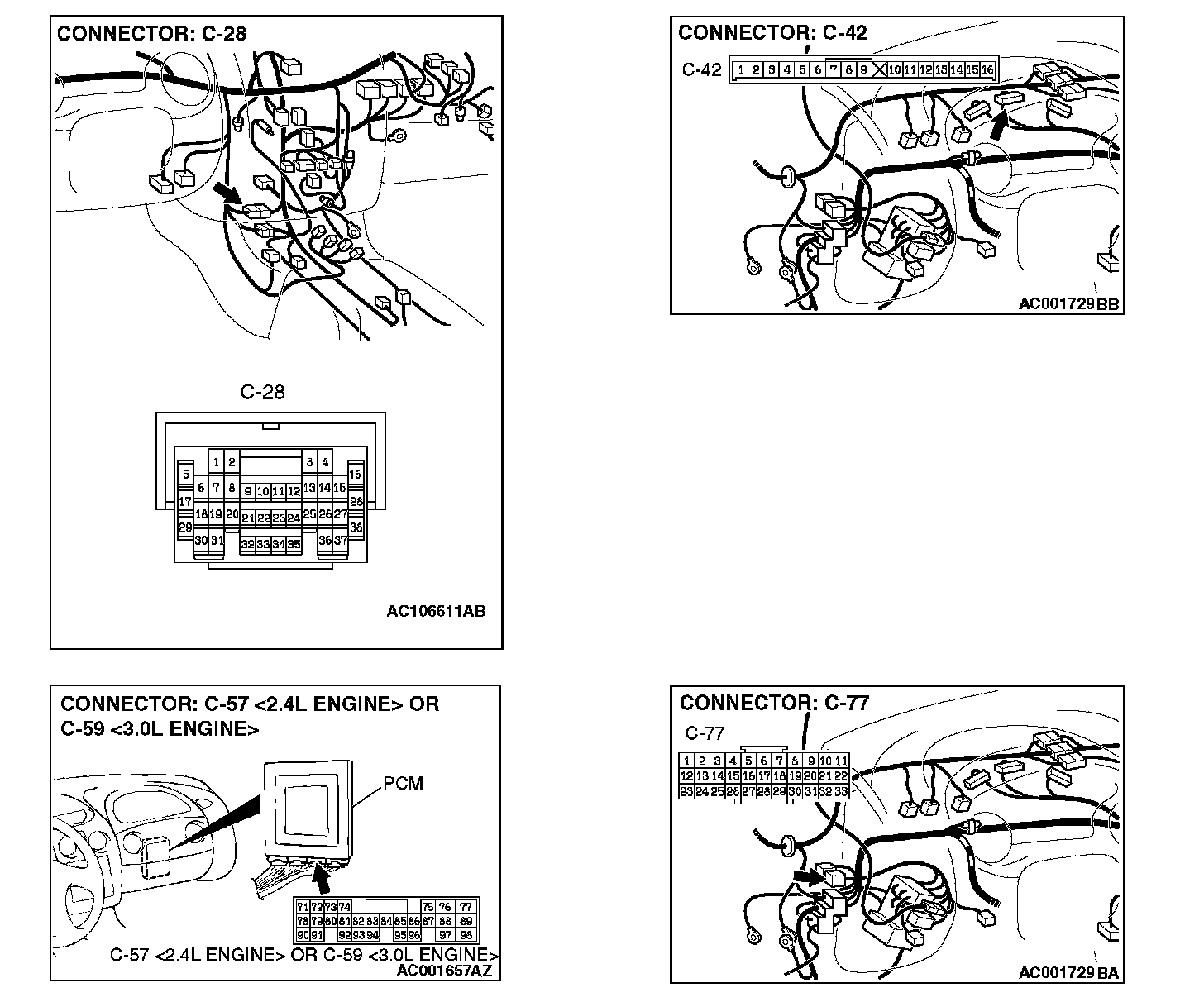 STEP 5. Check PCM connector C-57 <2.4L Engine> or C-59 <3.0L Engine>, intermediate connector C-28, joint connector C-77 and combination meter connector C-42 for loose, corroded or damaged terminals, or terminals pushed back in the connector.