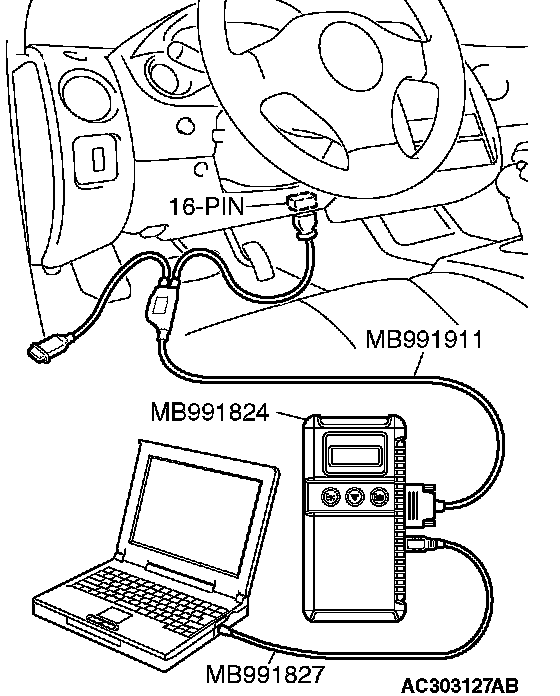 CAUTION: To prevent damage to scan tool MB991958, always turn the ignition switch to the "LOCK" (OFF) position before connecting or disconnecting scan tool MB991958.