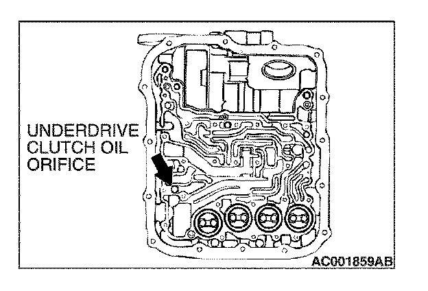2. Blow 108 kPa (15 psi) compressed air into the underdrive clutch oil orifice of the transaxle case, and check if the underdrive clutch piston moves and air pressure is maintained in that condition.