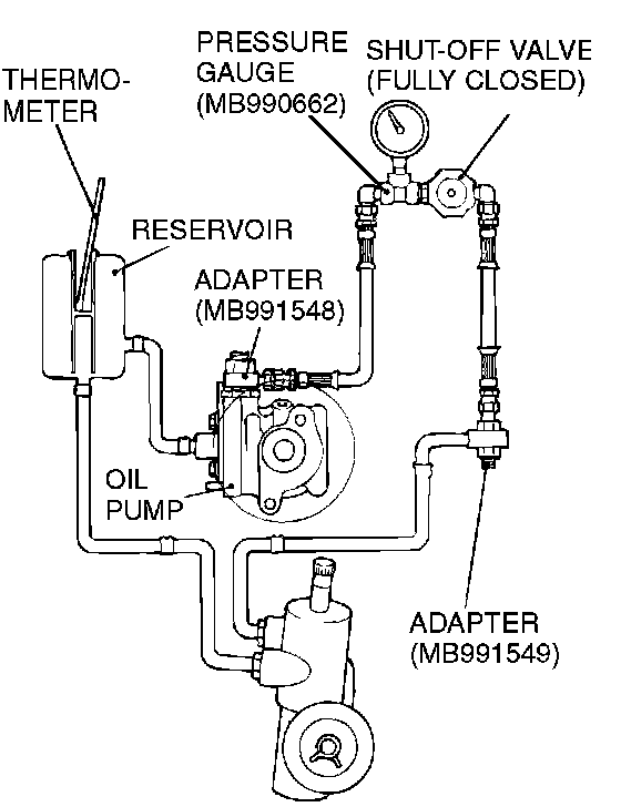 1. Disconnect the pressure hose from the oil pump, and then connect special tools MB991548, MB990662 and MB991549.