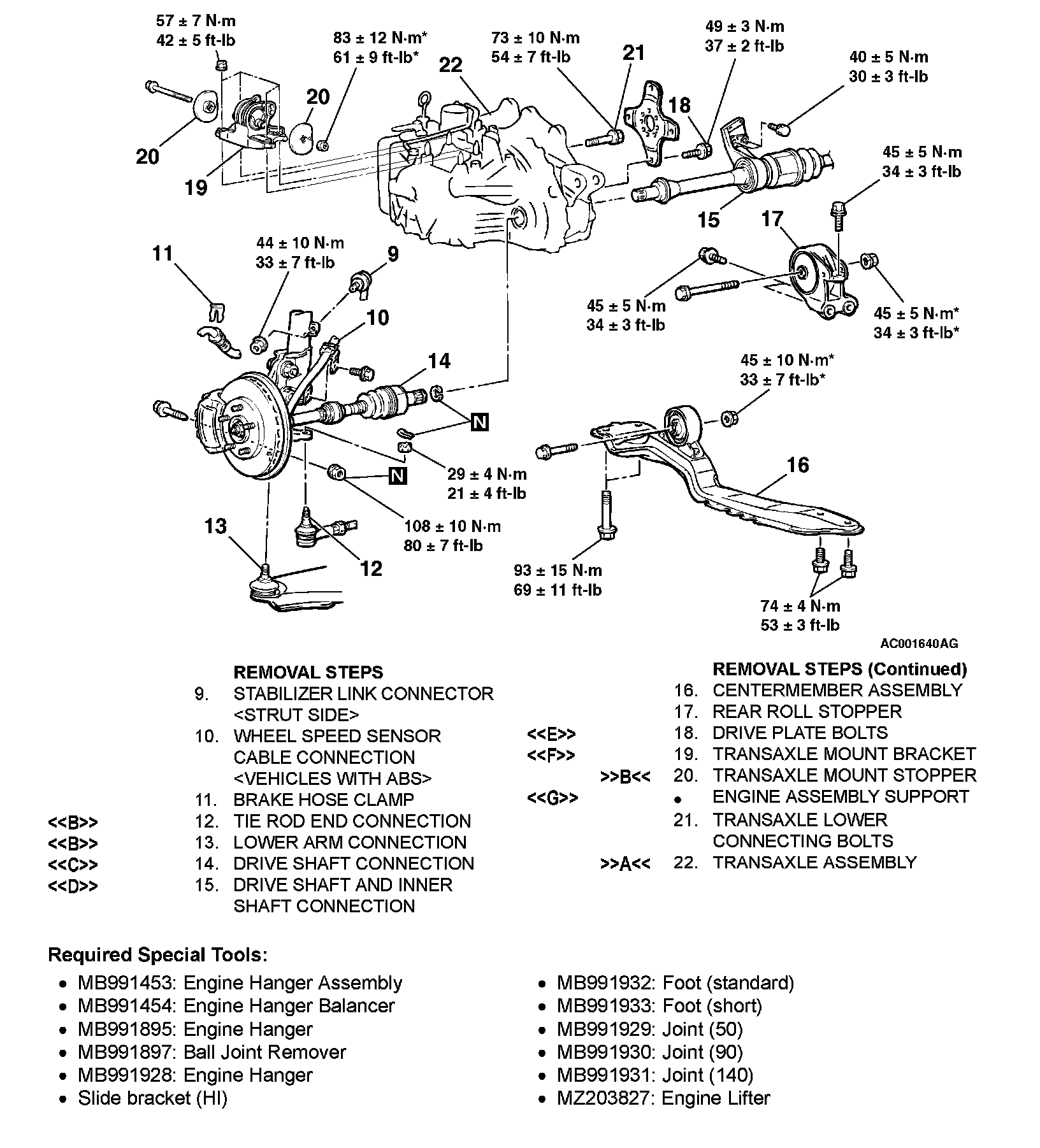 3. Set special tools MB991454 to hold the engine/transaxle assembly.
