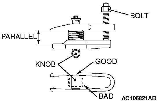 2. After turning the bolt and knob to adjust the insert arms of the special tool MB991897 in parallel, tighten the bolt by hand and confirm that the insert arms are parallel.