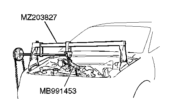 1. Set special tool MB991895 to the front fender mounting bolts (A and B) and the radiator support upper insulator mounting bolts (C and D), which are located in the engine compartment, as shown.