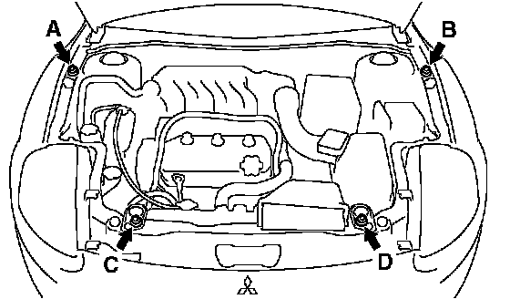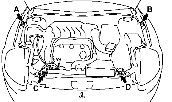 2. Set the engine hanger (special tool MB991928) to the front fender mounting bolts (A and B) and the radiator support upper insulator mounting bolts (C and D), which are located in the engine compartment, as shown.