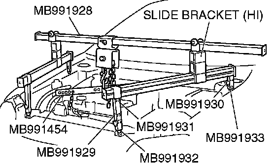 1. Assemble the engine hanger (special tool MB991928). Set following parts to the base hanger.