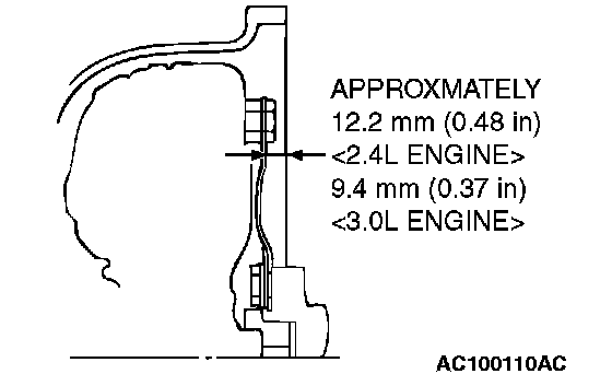 Insert the torque converter into the transaxle oil pump until the dimension is approximately 12.2 mm (0.48 inch) <2.4L ENGINE>, approximately 9.4 mm (0.37 inch) <3.0L ENGINE>. Install the transaxle assembly to the engine.