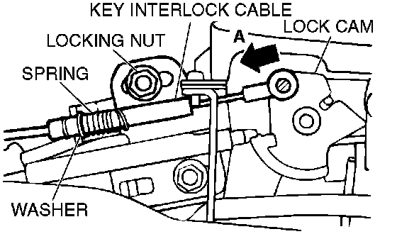 4. Lightly push the key interlock cable into the key interlock cable housing toward the arrow (A) direction until the cable movement stops and the cable end eye is aligned with the shaft on the lock cam. Tighten the locking nut. Snap the cable end eye onto the shaft of the lock cam.