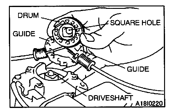 4. Align the power window motor drive shaft and the square hole in the drum by the following procedure, while using the guide and the opening in the motor housing as a reference for the installation position.