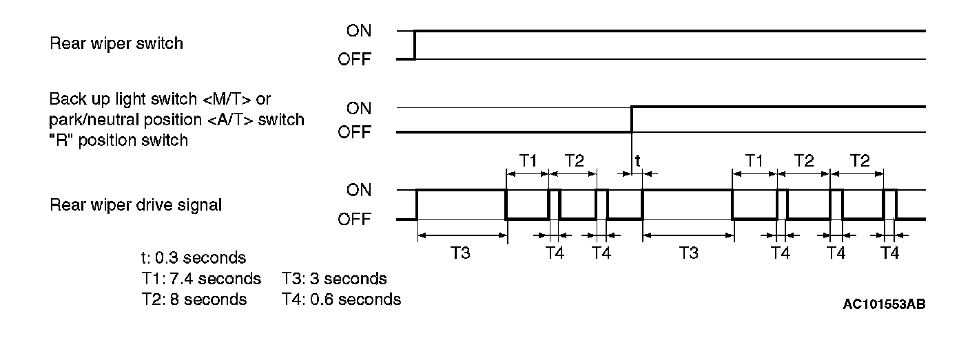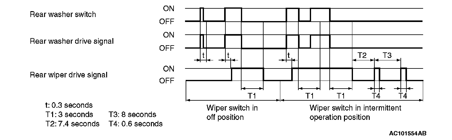 If the rear wiper switch of the column switch assembly is turned ON with the ignition switch in the ACC or ON position, the ETACS-ECU will turn the rear wiper drive signal ON for three seconds (approximately two operations), and then will carry out intermittent operation in a 7.4 to 8-second cycle.