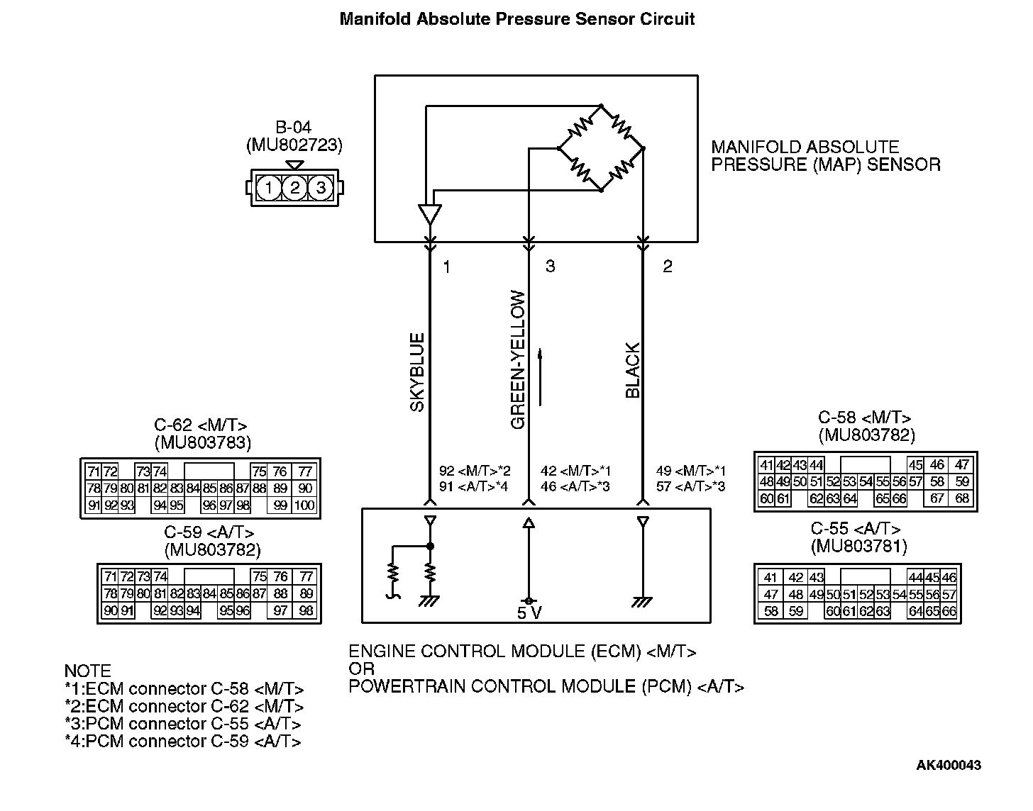 - A 5-volt voltage is supplied to the manifold absolute pressure sensor power terminal (terminal No. 3) from the ECM (terminal No. 42) or PCM (terminal No. 46). The ground terminal (terminal No. 2) is grounded with ECM (terminal No. 49) or PCM (terminal No. 57).