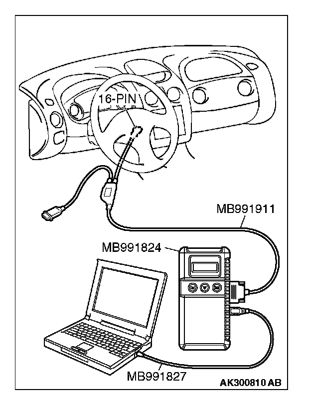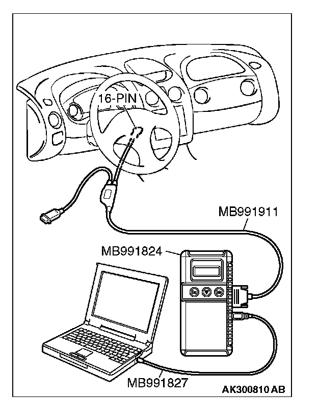CAUTION: To prevent damage to scan tool MB991958, always turn the ignition switch to the "LOCK" (OFF) position before connecting or disconnecting scan tool MB991958.