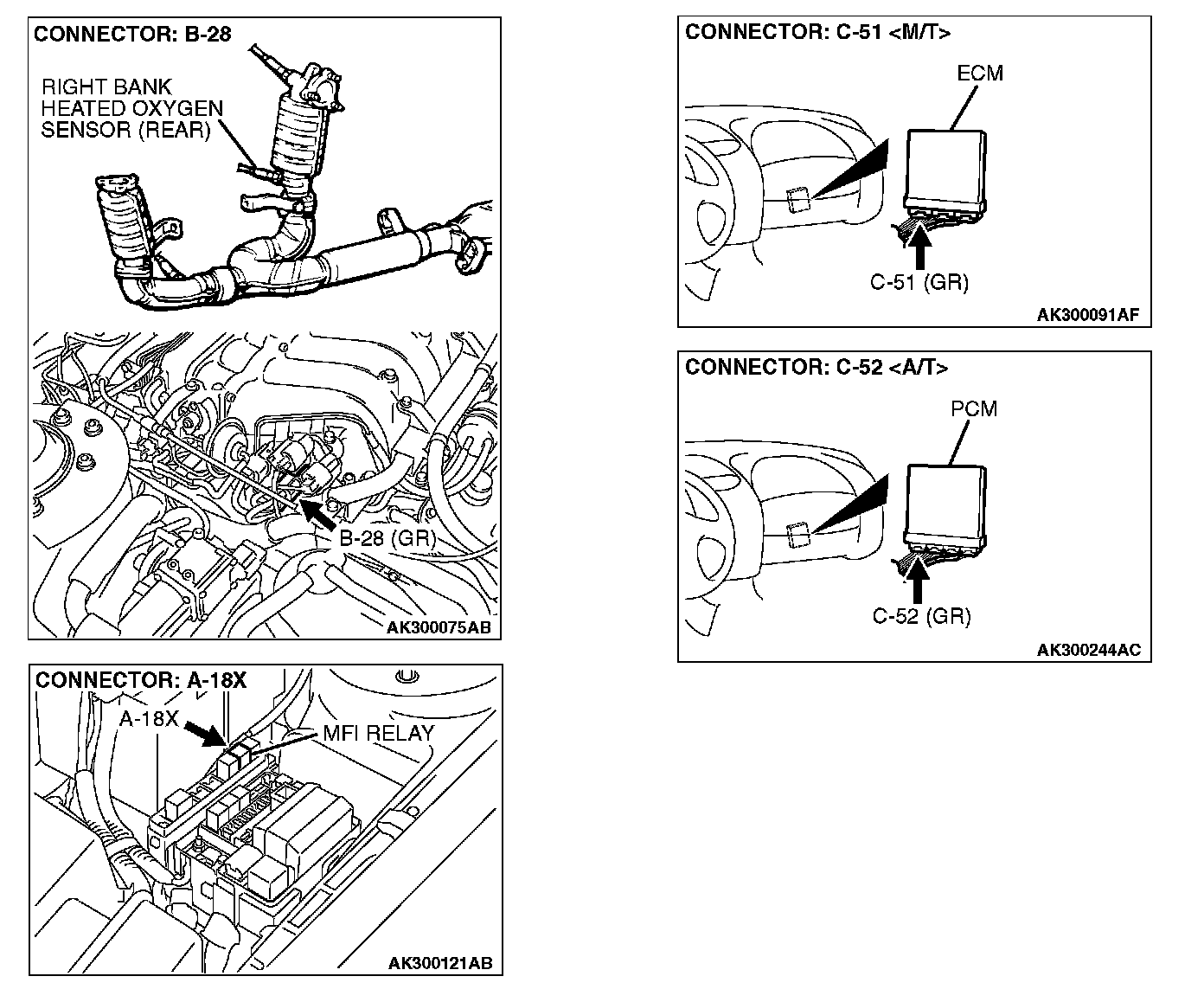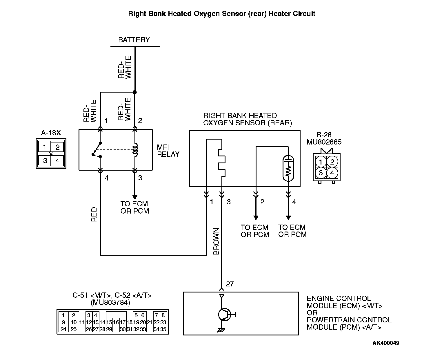 STEP 9. Check for harness damage between MFI relay connector A-18X (terminal No. 4) and right bank heated oxygen sensor (rear) connector B-28 (terminal No. 1).