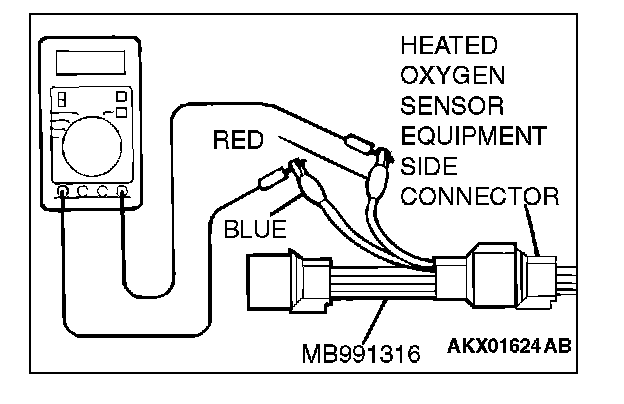 2. Measure the resistance between heated oxygen sensor connector terminal No. 1 (red clip) and terminal No. 3 (blue clip).
