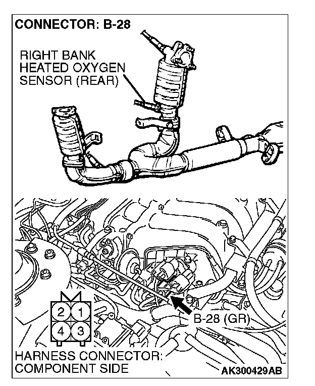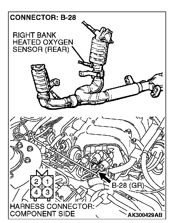 1. Disconnect right bank heated oxygen sensor (rear) connector B-28 and connect test harness special tool, MB991316, to the connector on the right bank heated oxygen (rear) sensor side.