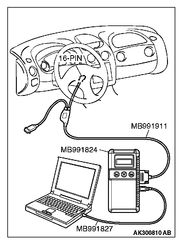 CAUTION: To prevent damage to scan tool MB991958, always turn the ignition switch to the "LOCK" (OFF) position before connecting or disconnecting scan tool MB991958.
