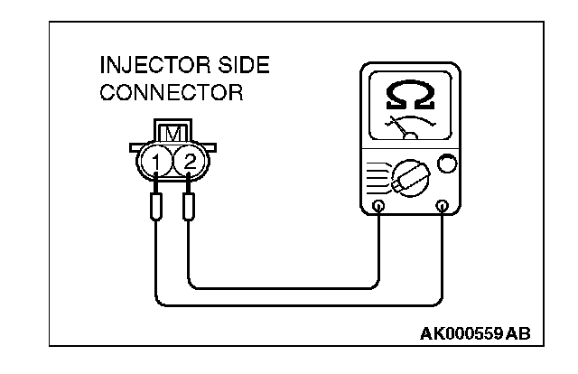2. Measure the resistance between each injector side connector terminal No. 1 and No. 2.