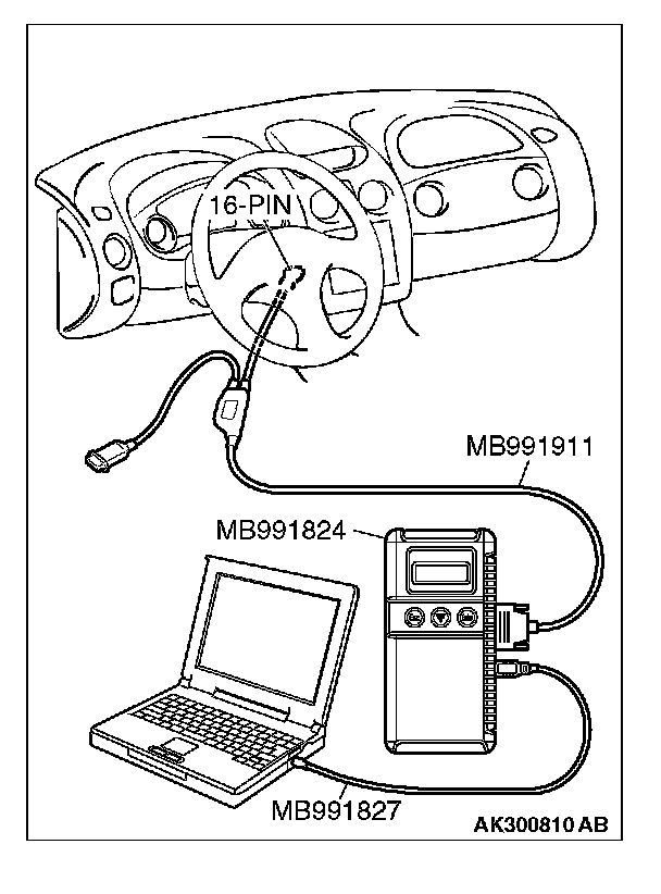 CAUTION: To prevent damage to scan tool MB991958, always turn the ignition switch to the "LOCK" (OFF) position before connecting or disconnecting scan tool MB991958.