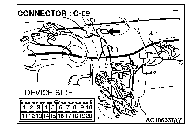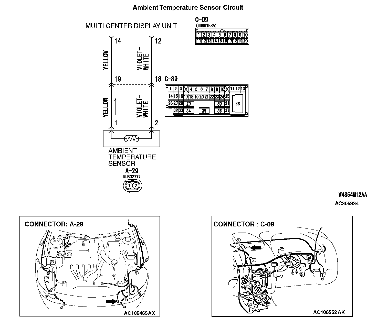 STEP 2. Check the wiring harness between ambient sensor connector A-29 (terminals 1 and 2) and multi-center display connector C-09 (terminals 14 and 12).
