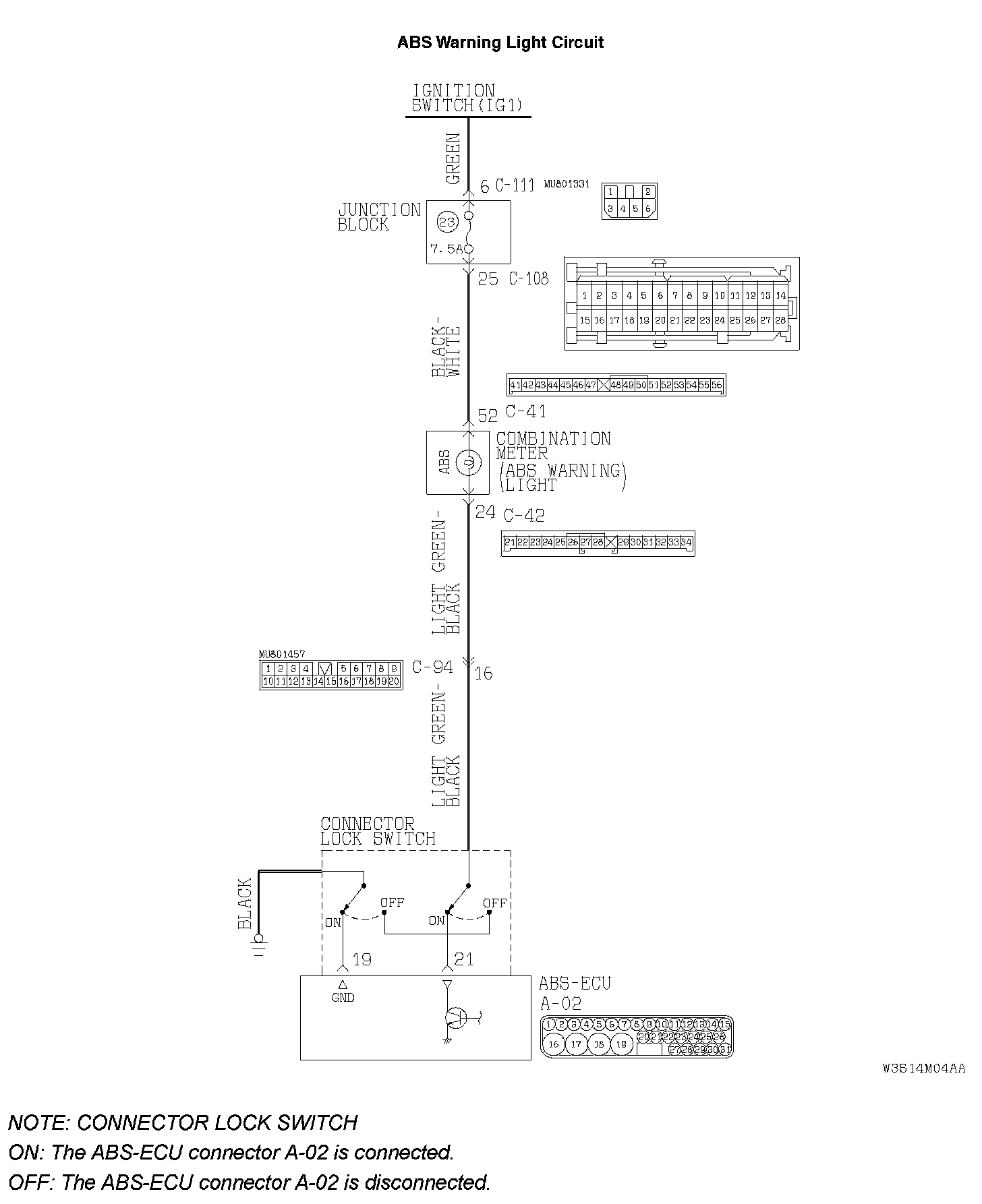 ^ When the ABS-ECU connector is disconnected, the circuit is grounded to illuminate the light by the connector lock switch OFF operation.