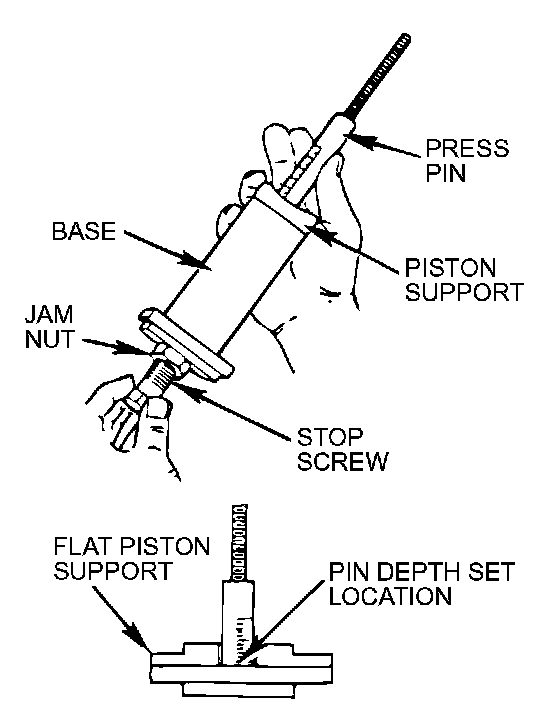 1. Thread the stop screw and jam nut assembly into the base. Fit the correct piston support on top of the base. Insert the press pin, threaded end up, into the hole in the piston support until the press pin touches the stop screw.