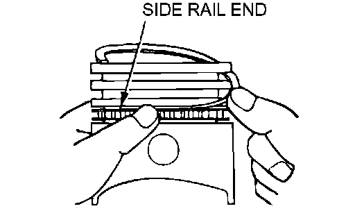2. Install the upper side rail. To install the side rail, first fit one end of the rail into the piston groove, then press the remaining portion into the position by finger. See illustration.