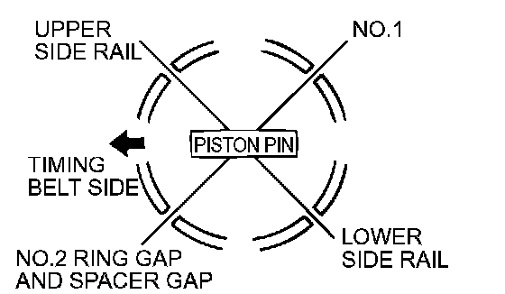 2. Arrange the piston ring and oil ring gaps (side rail and spacer) as shown in the illustration.