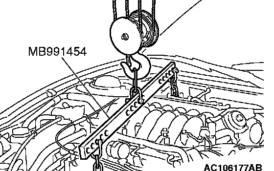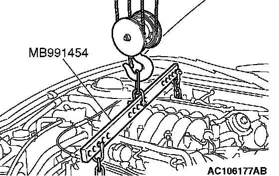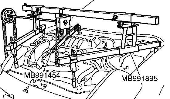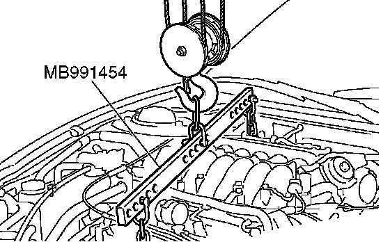 2. Remove the chain block and support the engine assembly with special tools MB991895.