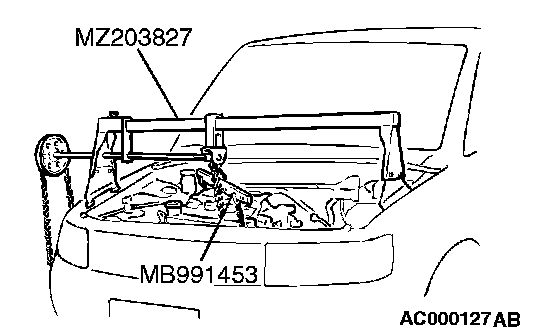 Remove the chain block and support the engine assembly with special tools MB991453 and MZ203827.