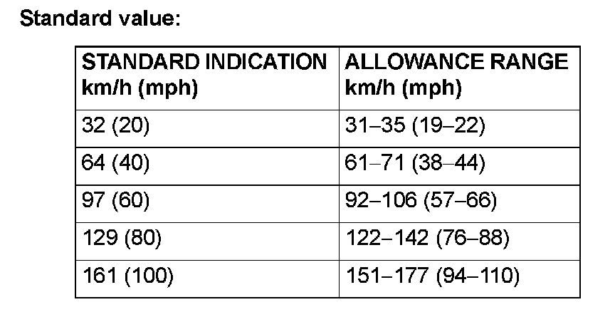 5. If not to the standard value, inspect for proper tire size. If not correct, replace the tires with original size tires and retest. If correct, replace the speedometer. If still not to standard value, replace the vehicle speed sensor.